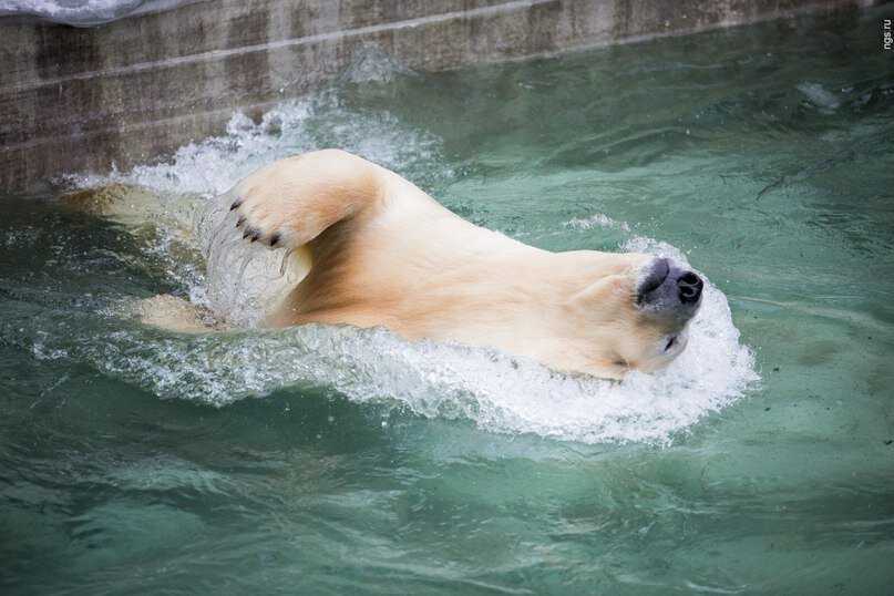 Белая медведица Услада вместе с внучкой Хаарчааной открыли в Ленинградском зоопарке купальный сезон, сообщает «Фонтанка».