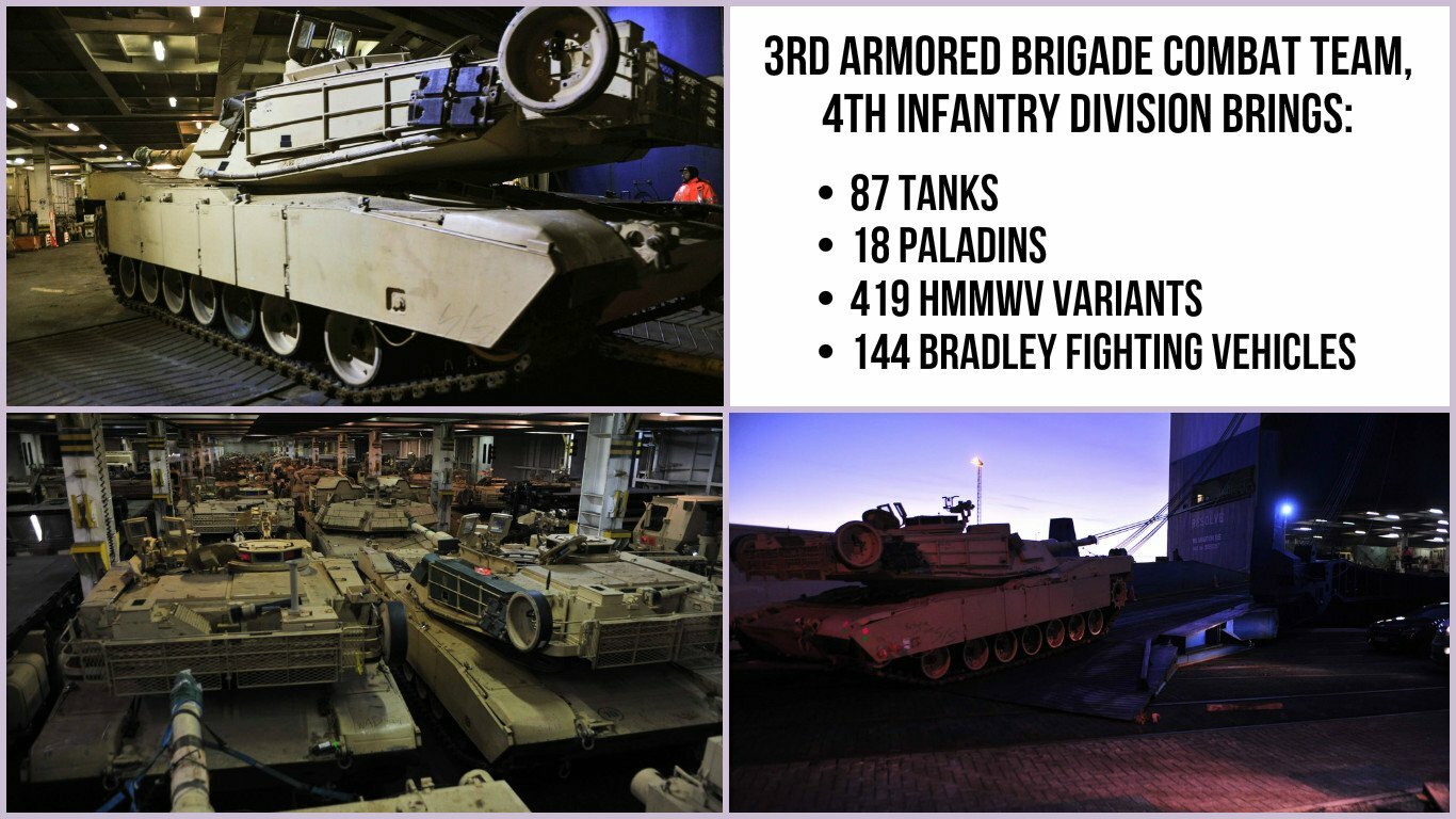 В Германию в порт Бремерхафен из США были доставлены 87 танков, 144 боевых машины пехоты, 18 самоходных артиллерийских установок и 419 автомобилей Humvee. Данная военная техника предназначена для усиления вооруженных сил НАТО в Восточной Европе.